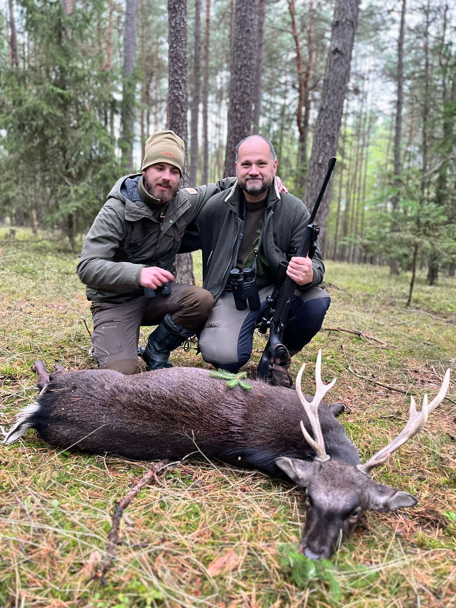 Sika hunting is all about patience and silence. The best method is from a high seat or slow stalking in the forest. The rut offers intense moments with loud calls echoing through the woods. These hunts are guided and carefully planned to ensure success and full respect for the animal.